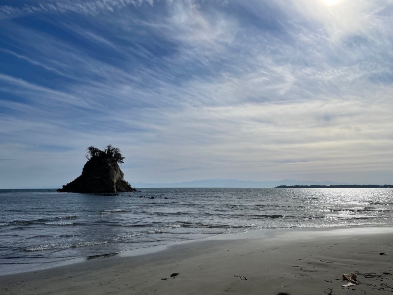 弘法大使が佐渡島から能登へ渡った際に最初に見つけたことが名前の由来となっている。日没から23時頃までのライトアップされた姿は幻想的な雰囲気を醸し出す。干潮時には島の近くまで歩いていくことも可能。