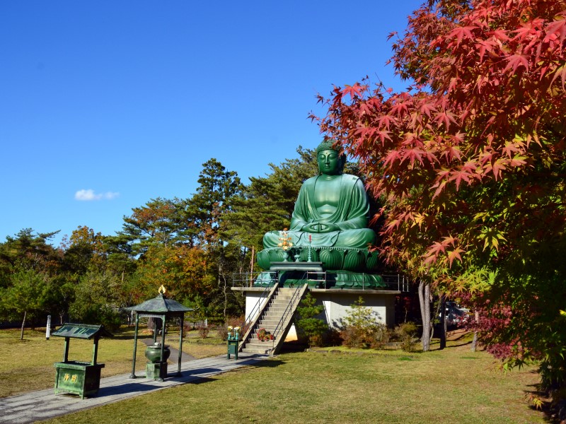 高さ8.4メートルの大仏は、乙ケ崎地区の海岸の高台の「真和園」に2003年6月に安置された。周囲は小公園になっており、三重塔のほか、親鸞聖人、観音様、弘法大師等の11の仏像が安置されており、真和園11ケ所巡りとして参詣者に親しまれています。町のシンボルでもあり、参拝に来られた方が長生きすると言われています。近くには、長寿への修行の道と言われている「遊歩道」や食べると1年間健康にすごせると言われている「そば処大仏庵」があり、長寿への秘訣を詰め込んだ場所になっています。